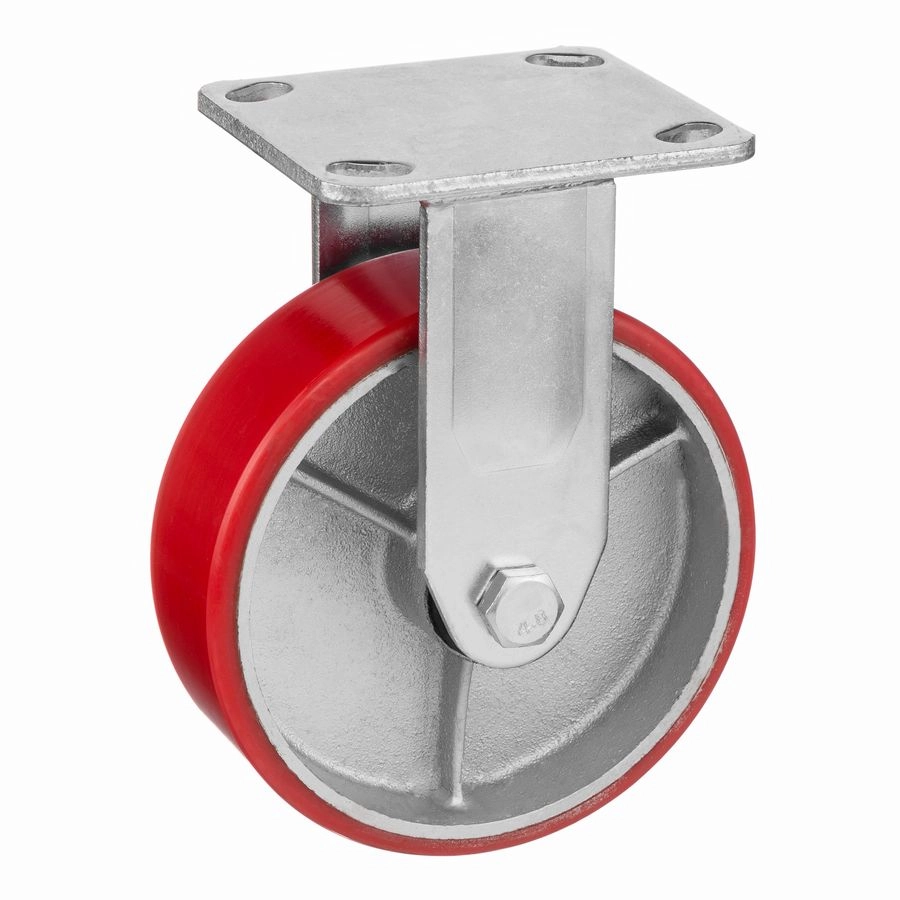 Колесо 1041-152, диаметр 152мм., чугун/полиуретан, неповоротное, игольчатый подшипник. Грузоподъемность 360кг. Колесо полиуретановое, центр из литого чугуна. В оси колеса-игольчатый подшипник. Стойкий к боковым ударам неповоротный кронштейн. Наличие масленки позволяет периодически обслуживать подшипник оси колеса. Крепление площадка под 4 болта. Колеса полиуретановые с чугунным сердечником широко применяются на бетонных полах преимущественно внутри помещений. Широко используются на тележках, строительных лесах и другом оборудовании, где требуется высокая грузоподъемность. При длительном нахождении под большой нагрузкой не деформируются. Возможно использование вне помещении на твердых покрытиях. Температура эксплуатации от -20 до +50С.
